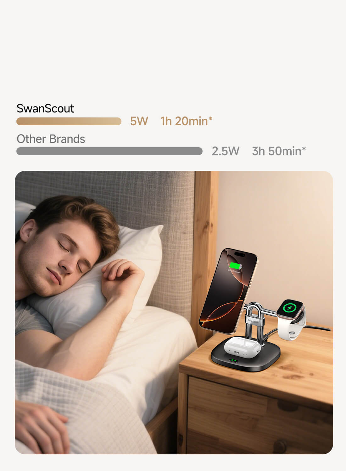 • Užijte si 5W rychlé nabíjení pro Apple Watch, které dosáhne 80 % za pouhých 51 minut — o 47 % rychleji než standardní 2.5W nabíječky.