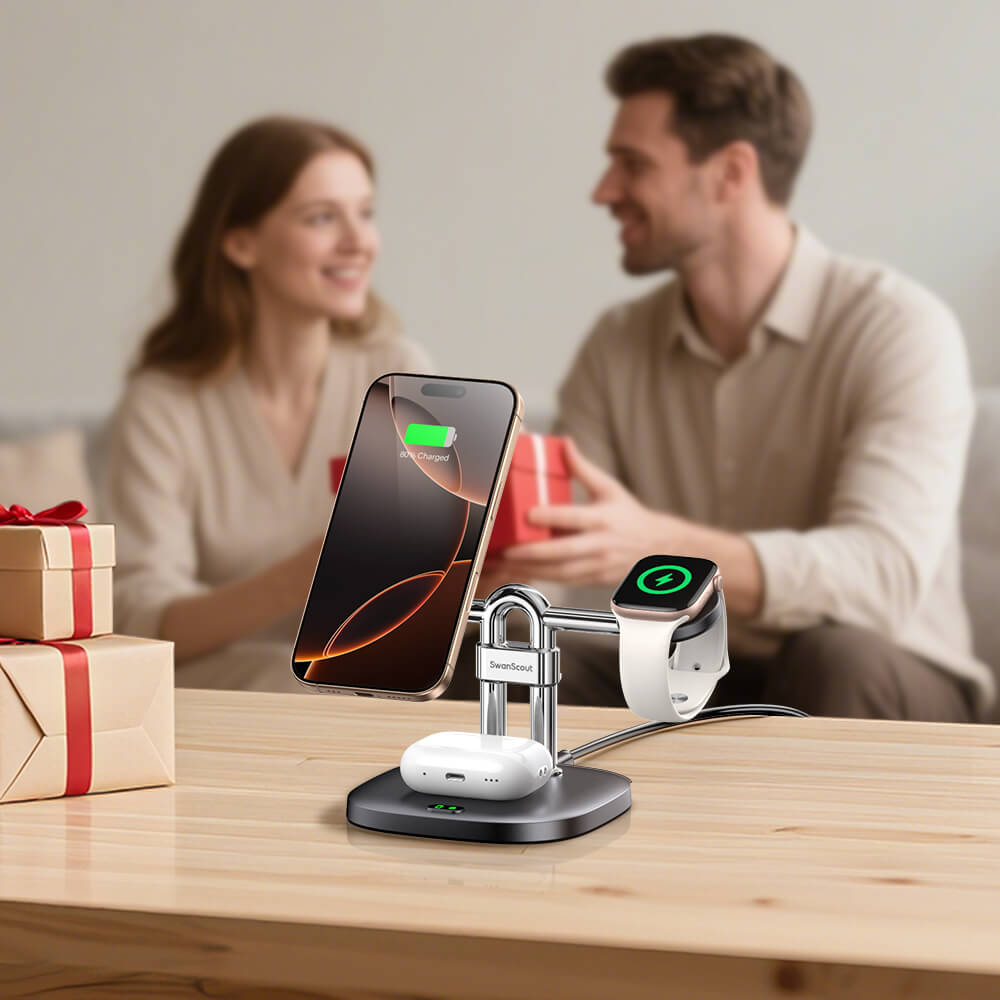 3 in 1 Wireless Charger Stand for MagSafe, SwanScout 712M, Magnetic Wireless Charging Station for Apple Devices, Charging Dock for iPhone 17/Air/16/15/14 Series, Apple Watch, AirPods (No Adapter)