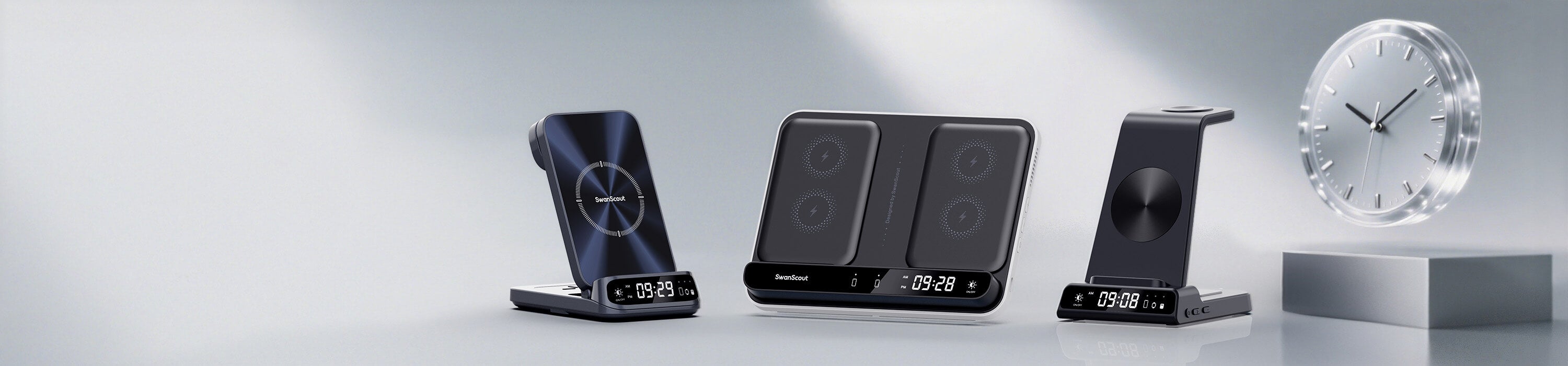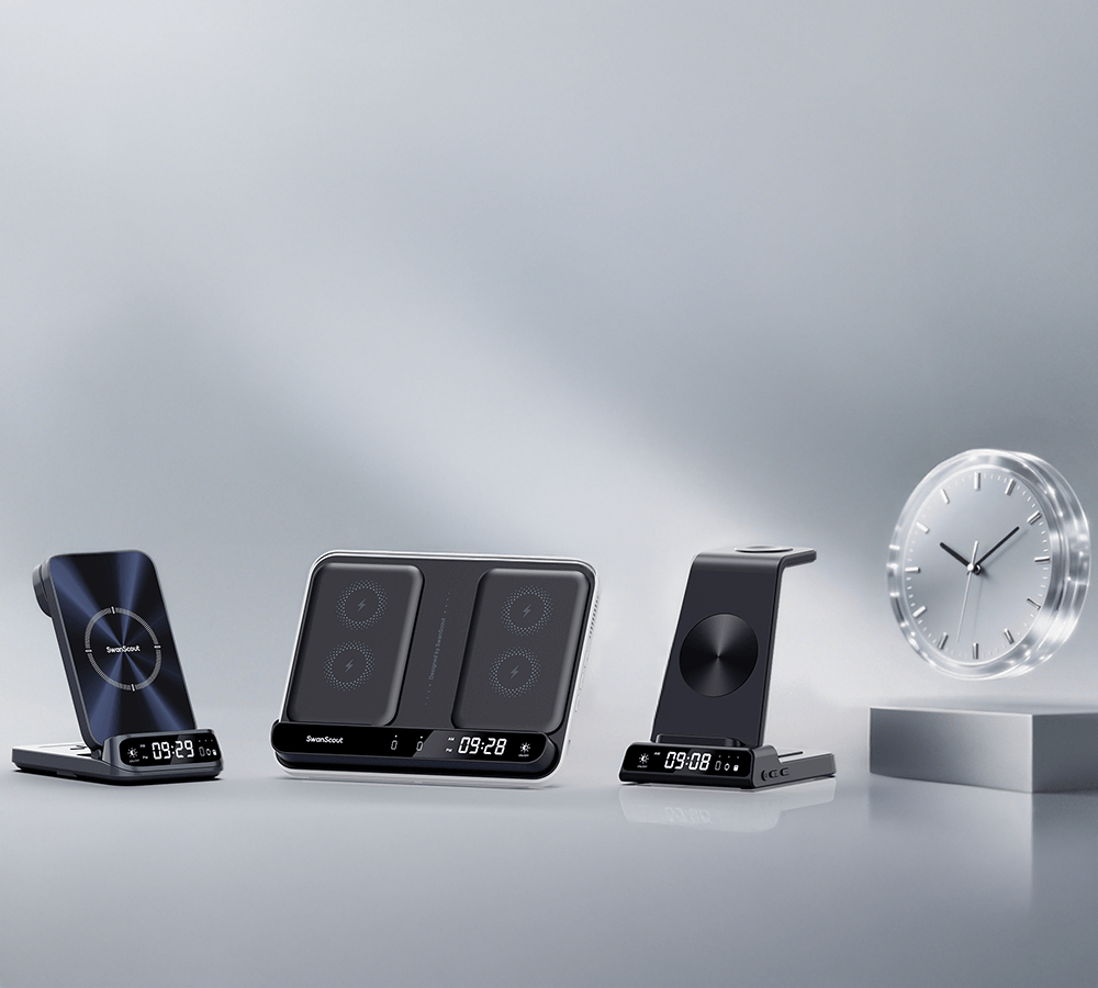 Die kabellosen Uhrenladegeräte von SwanScout vereinen schnelles magnetisches Laden und eine übersichtliche Digitaluhr in einem eleganten Gerät. Ob am Schreibtisch, am Bett oder im Arbeitszimmer – Sie können Ihr Telefon mit Strom versorgen und Ihren Zeitplan einhalten – und gleichzeitig für einen sauberen, organisierten Arbeitsplatz sorgen.