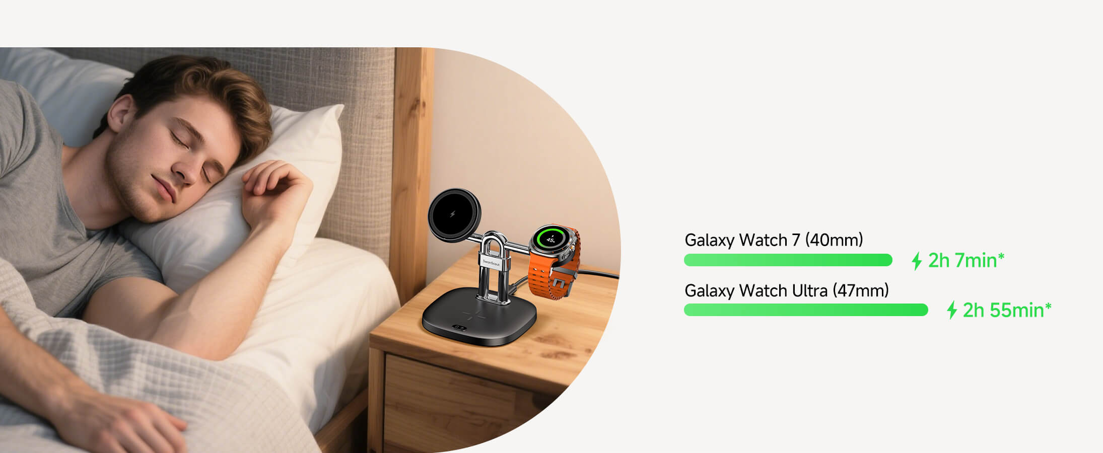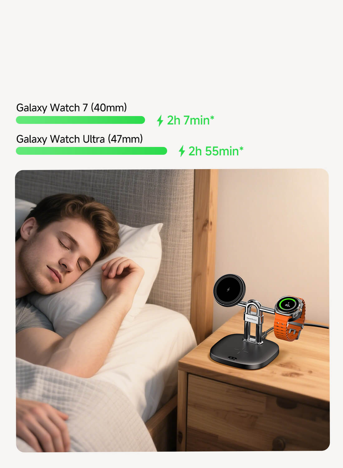 - Der Ladebereich für die Uhr unterstützt 3W-Schnellladen; die Galaxy Watch 7 (40 mm) erreicht 0–80 % in nur 1 Stunde und 20 Minuten.