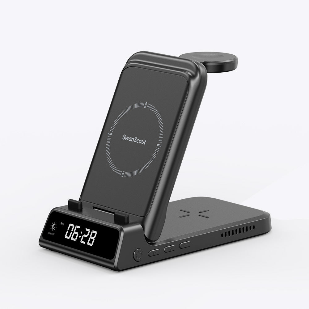 Sí, muchos de nuestros cargadores, como el SwanScout 703A, están diseñados para la carga 3 en 1, lo que le permite cargar su iPhone, Apple Watch y AirPods simultáneamente. Cada dispositivo se carga de forma independiente, lo que hace que estos cargadores sean ideales para usar en el escritorio o en la mesita de noche.