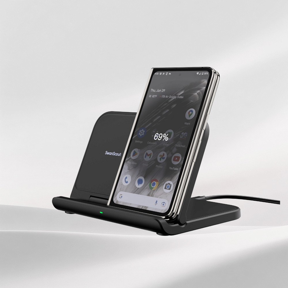 Debido a una posición ligeramente diferente de la bobina en el Pixel 9 Pro Fold en comparación con otros modelos Pixel, recomendamos el SwanScout 708G2. Para garantizar una alineación óptima y una carga estable, el 708G2 incluye una almohadilla de posicionamiento de plástico extraíble. Utilice la almohadilla cuando cargue el Pixel 9 Pro Fold para elevar el teléfono y alinear la bobina con precisión. Para otros modelos Pixel, la almohadilla no es necesaria. Este diseño tan bien pensado garantiza la compatibilidad entre modelos, una carga eficiente y una colocación segura del dispositivo.