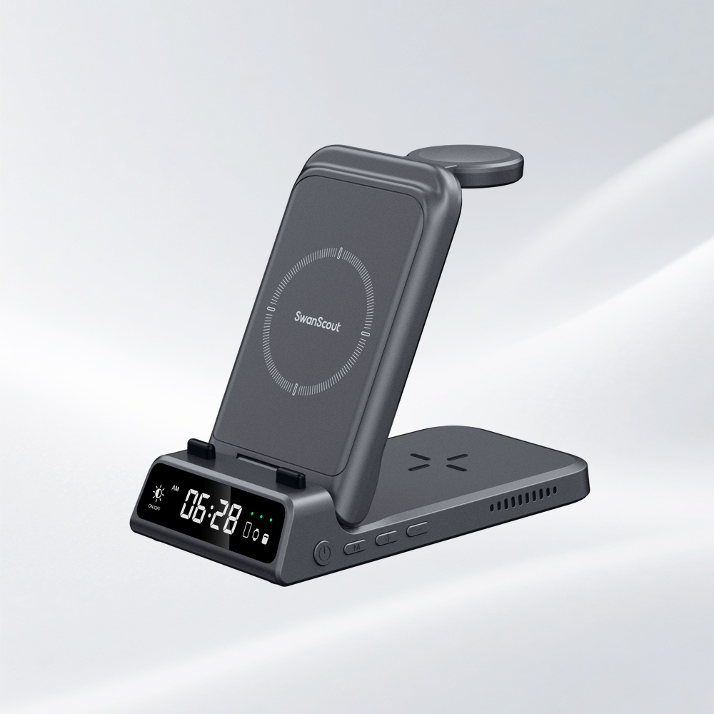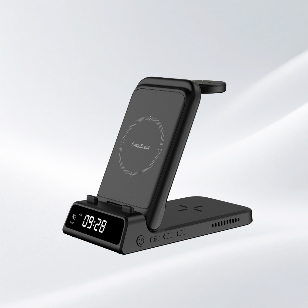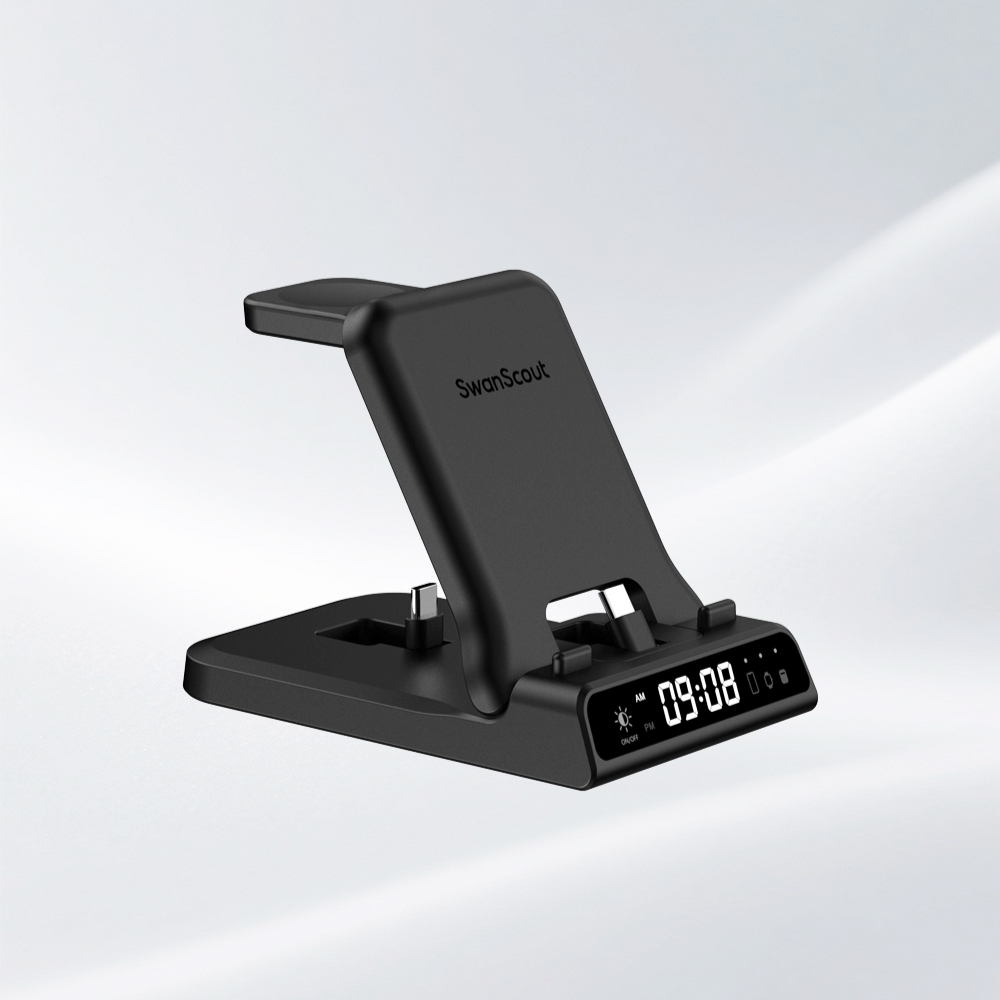 SwanScout 701A is a 3-in-1 wired fast charger compatible with Apple phones, watches, and earbuds, offering stable and efficient charging in one sleek unit.The swanscout 701A is a stylish alarm clock with cell phone charger, combining fast charging with a digital time display for added convenience.