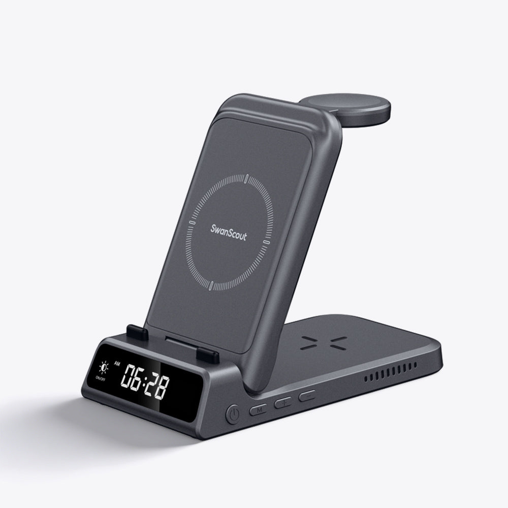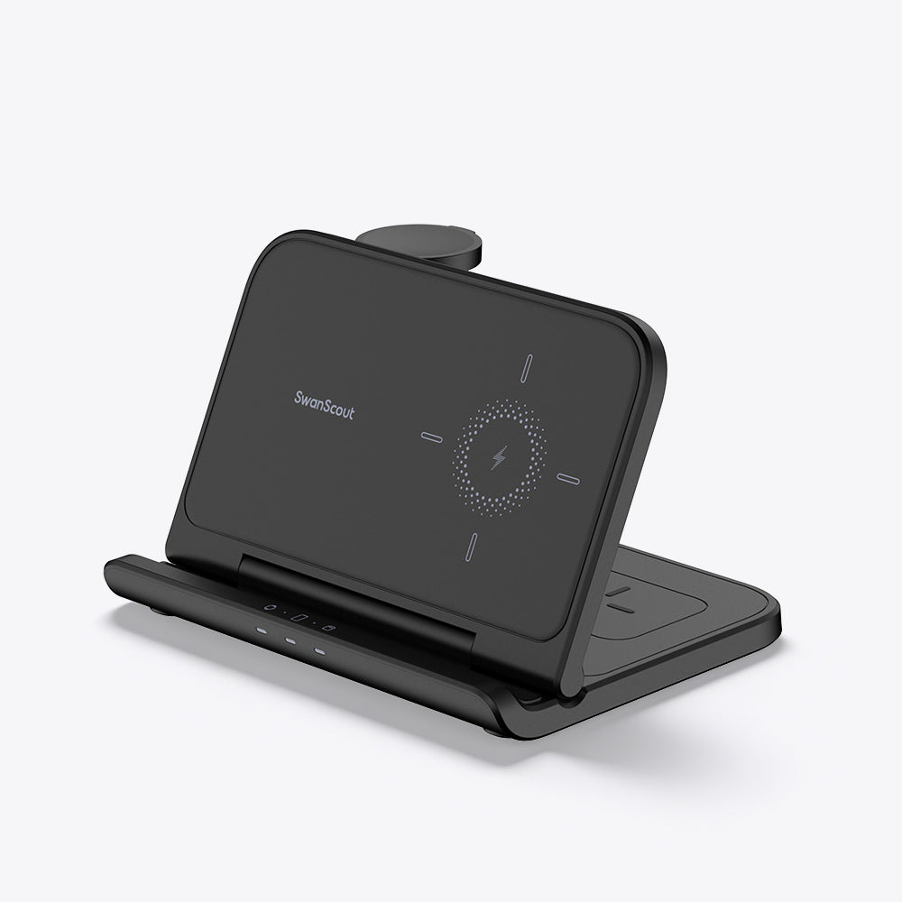 SwanScout 707S is a stable and elegant 3-in-1 wireless charger compatible with Samsung devices.The SwanScout 707S is a sleek Samsung wireless charging station built for daily efficiency and smart device organization.