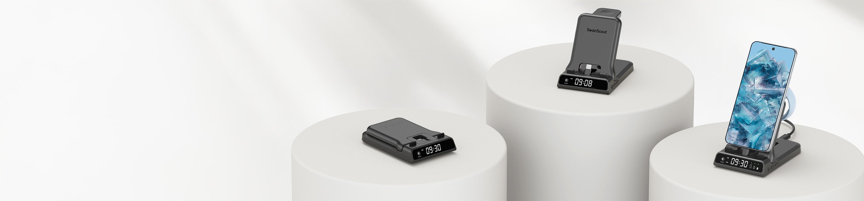 SwanScout 701A is a 3-in-1 wired fast charger compatible with Apple phones, watches, and earbuds, offering stable and efficient charging in one sleek unit.The swanscout 701A is a stylish alarm clock with cell phone charger, combining fast charging with a digital time display for added convenience.