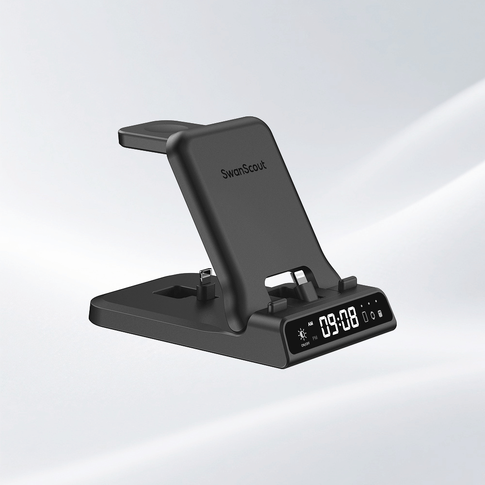 A estação de carregamento 3 em 1 da SwanScout é compatível com dispositivos que não sejam da Apple e compatíveis com as normas de carregamento sem fios (por exemplo, telemóveis Android selecionados e auscultadores sem fios) nas áreas para telemóveis e auscultadores, mas a área para relógio é exclusiva do Apple Watch. Para carregamento magnético, os dispositivos anteriores ao iPhone 12 requerem compatibilidade magnética ou uma capa magnética.