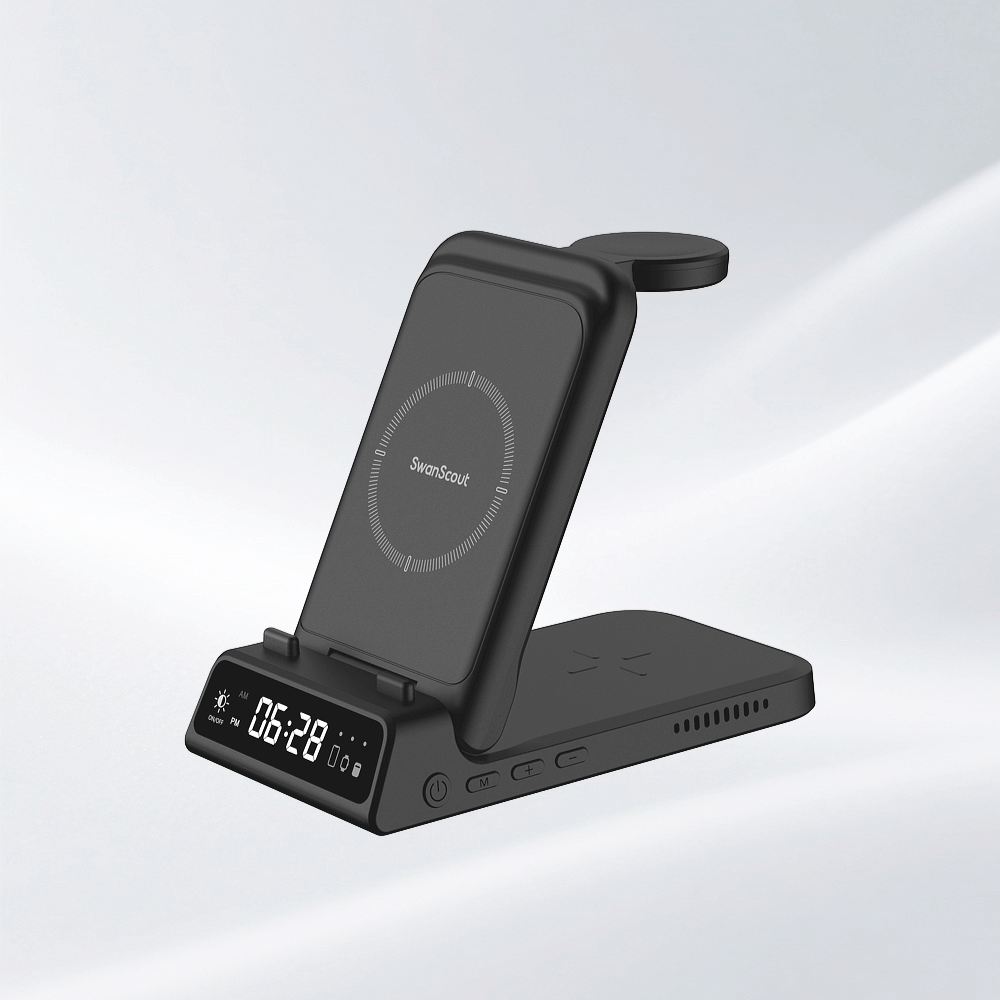 A estação de carregamento 3 em 1 da SwanScout é compatível com dispositivos que não sejam da Samsung e compatíveis com as normas de carregamento sem fios (por exemplo, iPhones ou telemóveis Android selecionados e auscultadores sem fios) nas áreas do telefone e dos auscultadores, mas a área do relógio é exclusiva do Galaxy Watch. Para o carregamento magnético, os telemóveis Samsung necessitam de uma capa magnética para garantir o carregamento adequado.