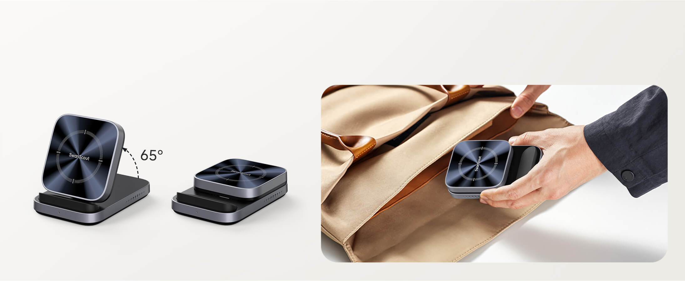 • Design portátil e dobrável: Leve e compacto, o design dobrável cabe facilmente em bolsas ou bolsos, mantendo o carregamento rápido disponível em casa, no escritório ou durante viagens.
