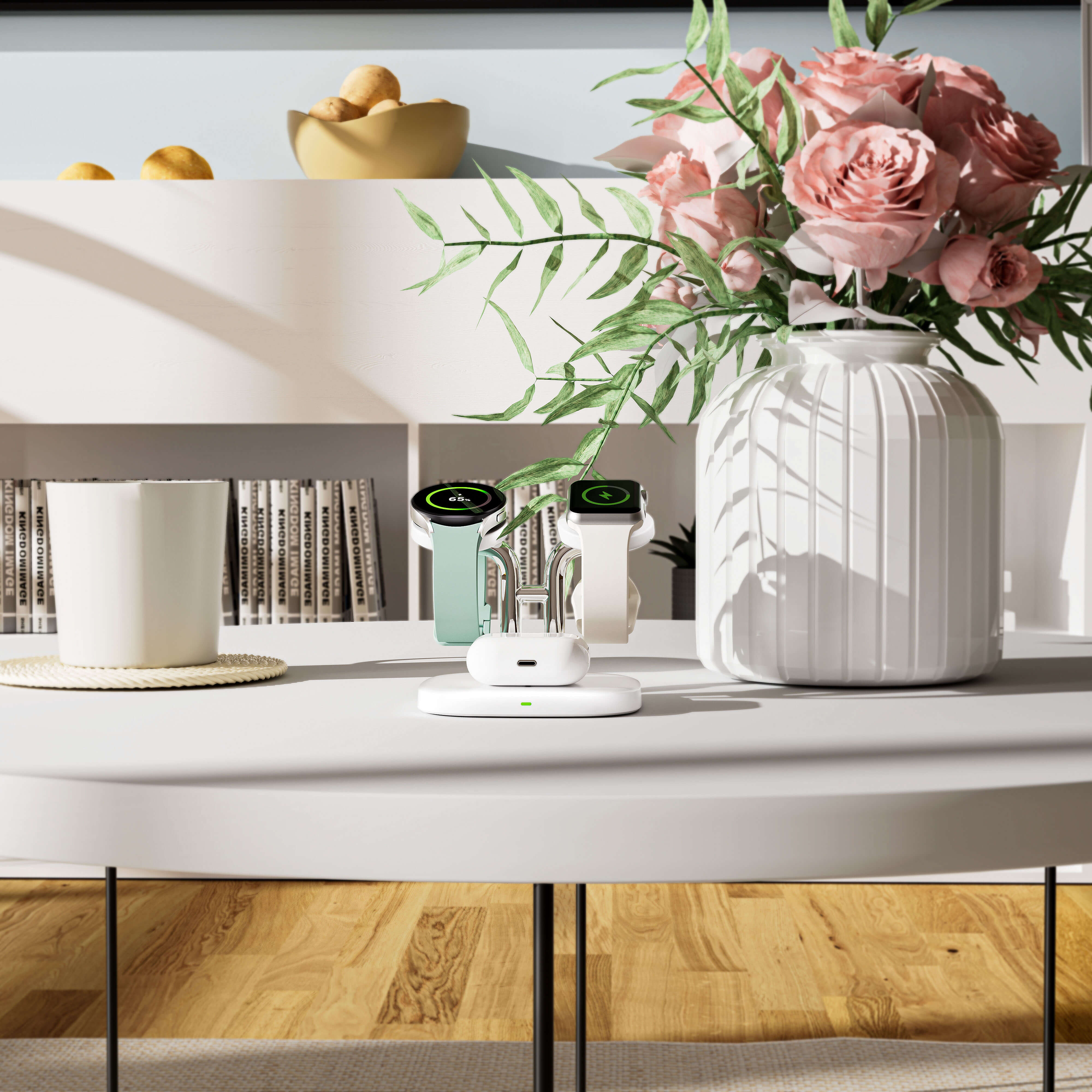 SwanScout 704D | Versatile dual-device wireless charger designed for Samsung, Apple Watch, and all wireless charging-compatible earphones. It features high-speed charging, multiple protection technologies, and easy power-up, all encapsulated in a clean and modern minimalist design.